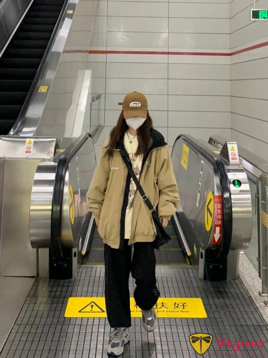 这件米色的宽松长袖外套看着就特别舒服!里面搭配棕色棒球帽,黑色围巾,深灰色运动裤和白色运动鞋,简直就是最标准的学生装打扮。最后再戴一只表,感觉整个人特别随性又有范儿。