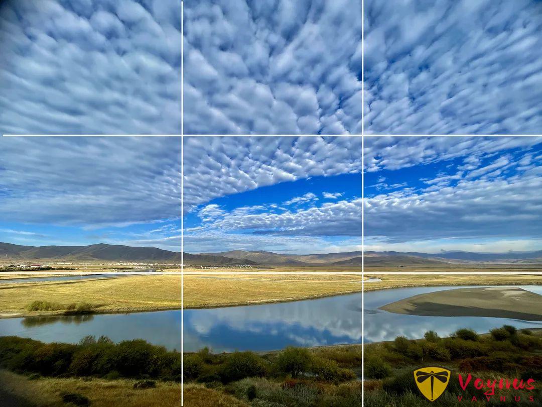 拍风景时,把地平线放在下方的横线上。这样拍出来的照片会更有层次感,不会显得呆板。
