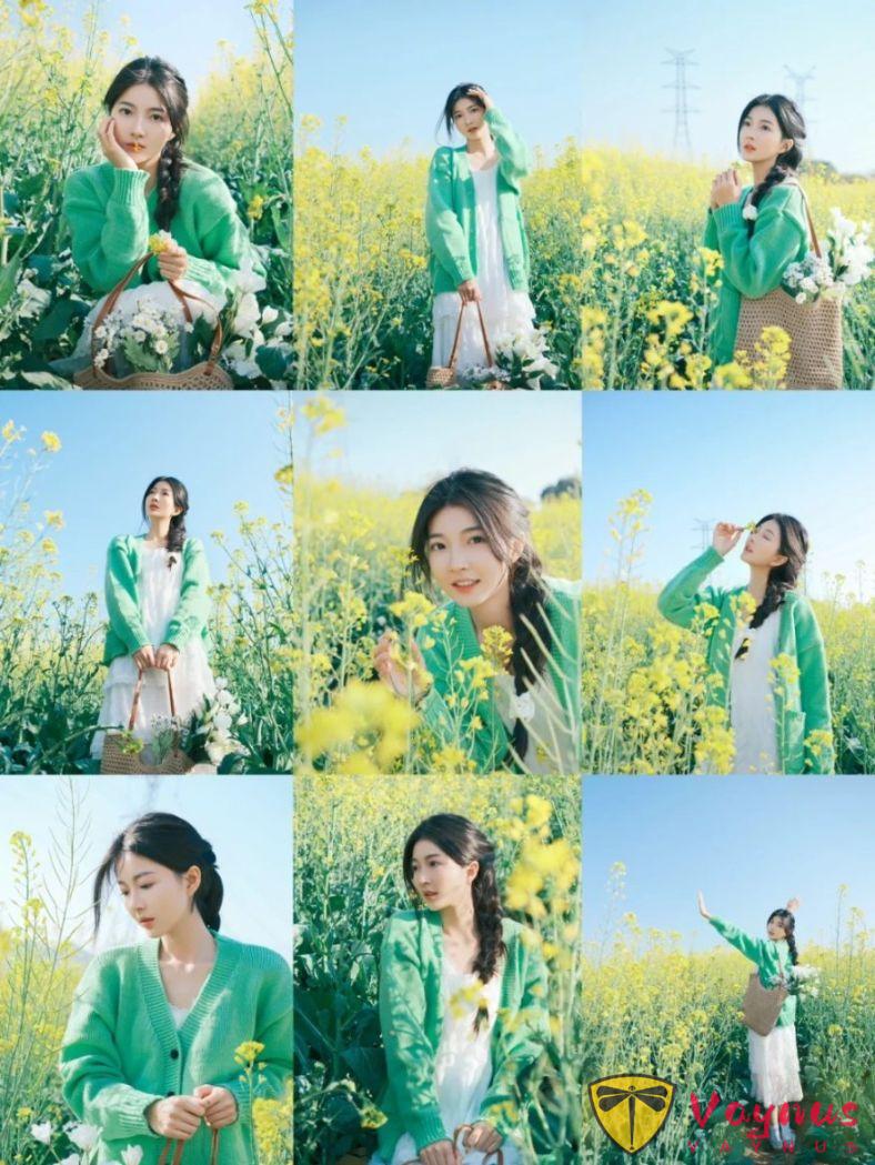相机镜头靠近花,用花作为前景虚化,虚实结合,照片更有层次感,人物可以低头看花,手轻轻触碰花瓣,拍出温柔的感觉。同时,前景虚化的油菜花让照片更具朦胧美,人物显得更加立体,氛围感直接拉满。