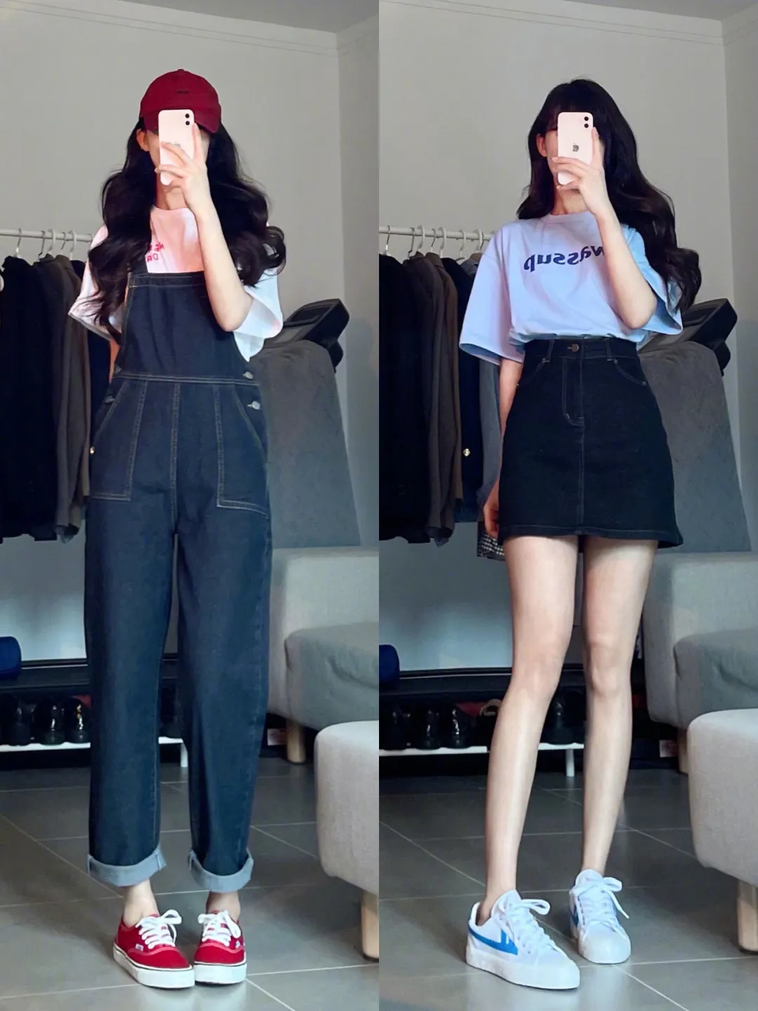 这一身搭配简单大方,深蓝色T恤与白色背带裤搭配舒适自然,粉色运动鞋增添了活力感。整体风格清新随性,但又不失时尚感。这种LOOK无论是上班日还是周末出街,都能轻松驾驭,特别适合喜欢轻松舒适风格的妹子。