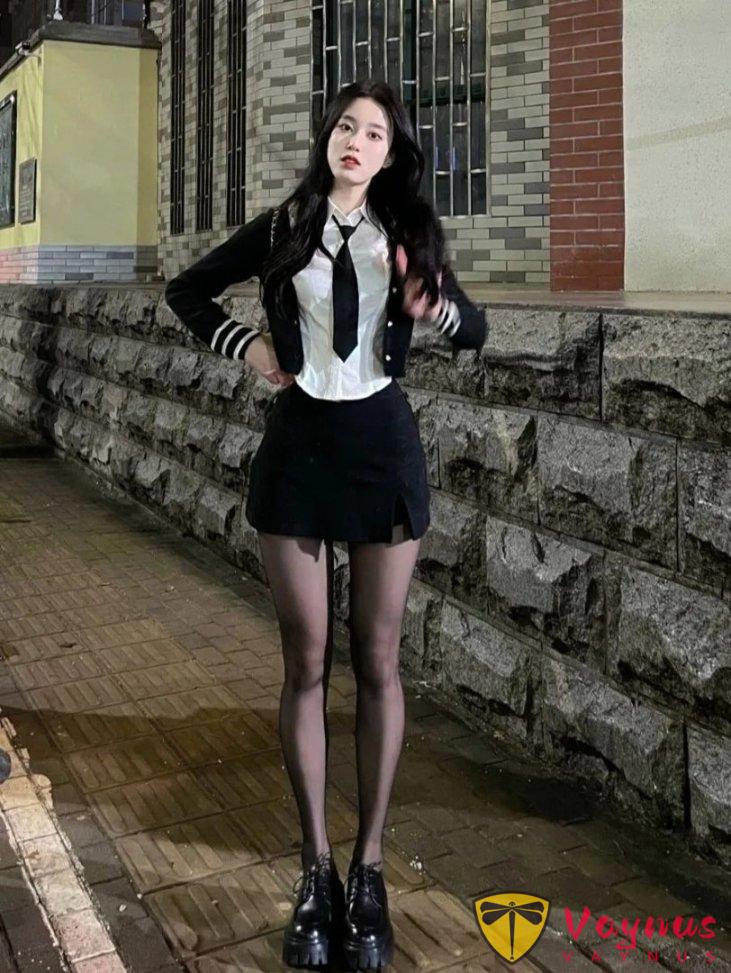 这套黑色套装明明就很简单,却难掩其中的学院风范。西装外套与白衬衫营造出干练感,红色领带和丝巾则增添了复古优雅。深蓝西装外套与黑丝袜马丁靴的搭配,更显时尚潮流。这样的学妹,定能成为全校的焦点!