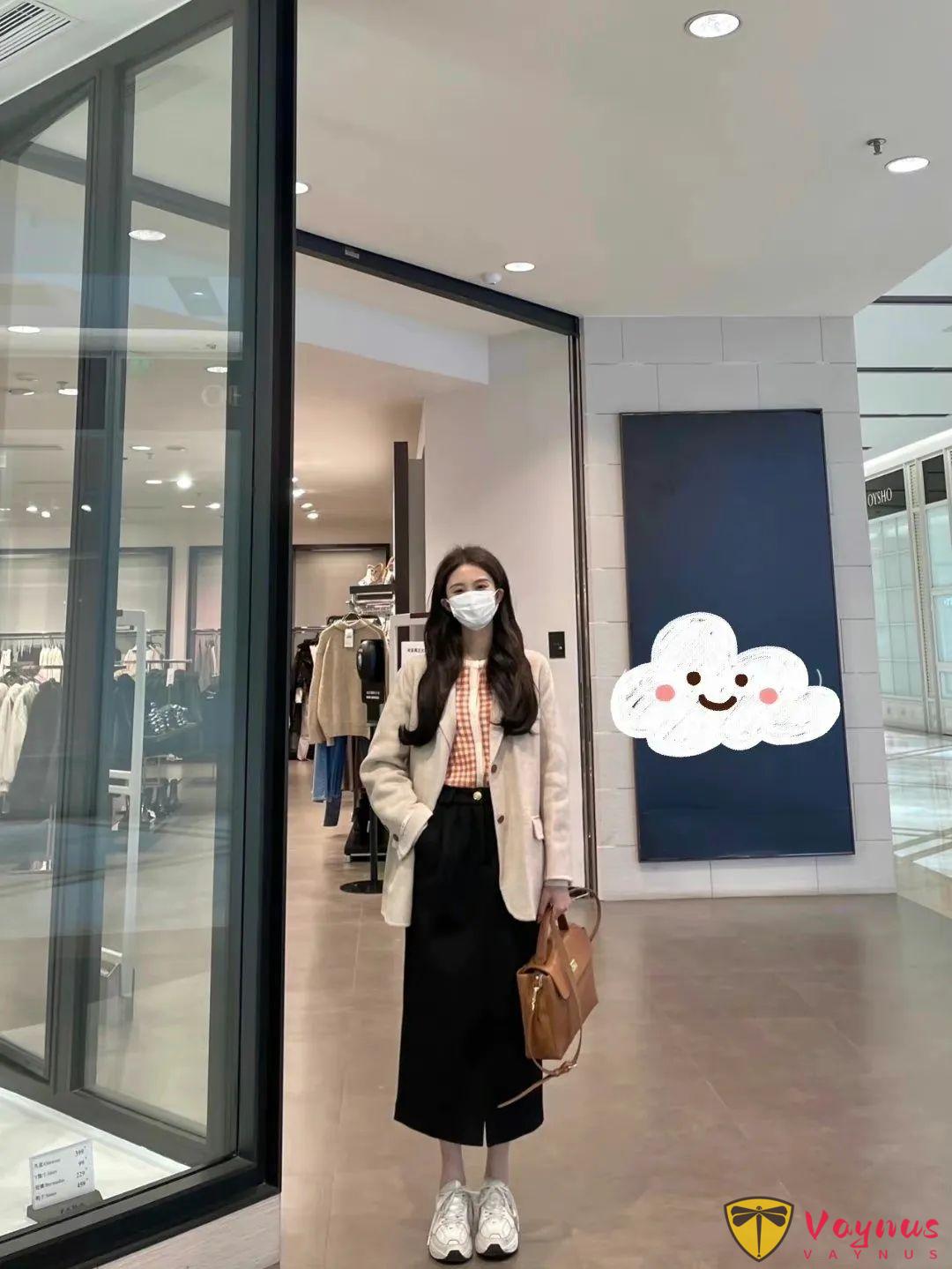 這套米色西裝外套太有質感了!裡面搭配格子襯衫,瀟灑又文藝。長腿美女配黑色長裙,酷酷的小姐姐feel。腳上一雙白色運動鞋,舒服又百搭。手拎一個棕色手拿包,知性優雅。加一個口罩,又多了一分安全感。整體來看,乾淨清爽,隨性中又不失chic,是不是很有feel?