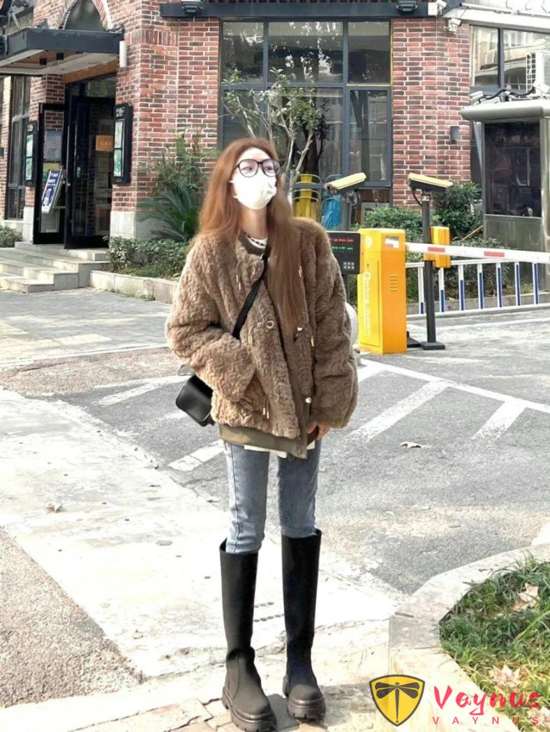綠色衛衣搭配藍色牛仔褲很常見,但是搭配上這件毛絨外套顏色還真有點少見。不過我覺得這樣搭配特別有質感,沉穩大方。再加上眼鏡框和口罩,整個look比較休閒,但又不失知性美。這種冬日穿搭非常適合冬日裏跟朋友逛街約會。