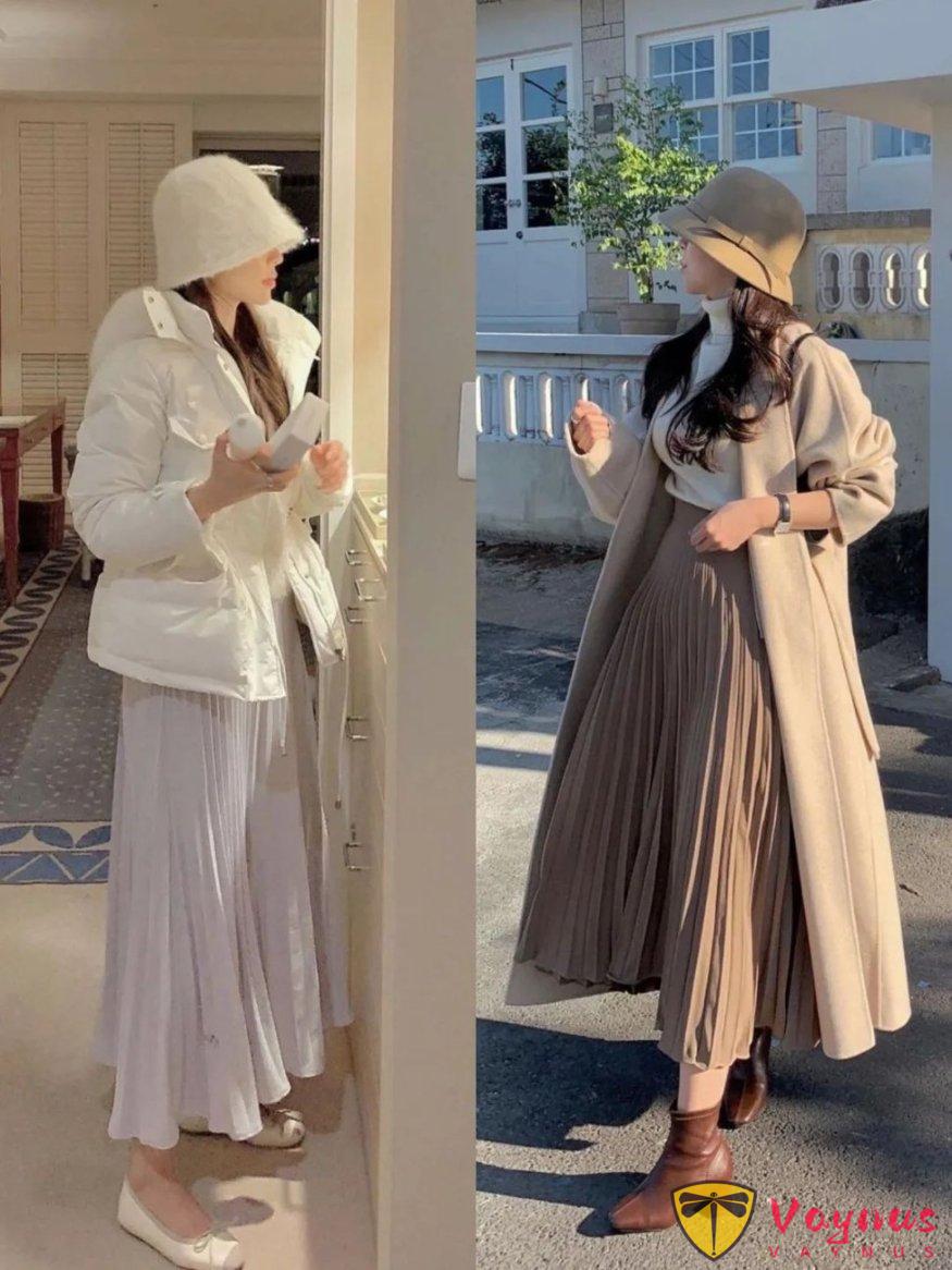 小美: 這件白色羽絨服跟白色高領毛衣、淺紫色百褶裙的搭配也超讚!再配上米色平底鞋和灰色帽子,整個人都散發著溫柔可人的氣質。