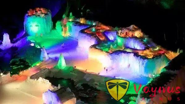 在白天時,人們可以看到剔透兩眼的水晶世界。到了晚上時,藉着五彩燈光,則會看到炫麗繽紛的夢幻景色。
